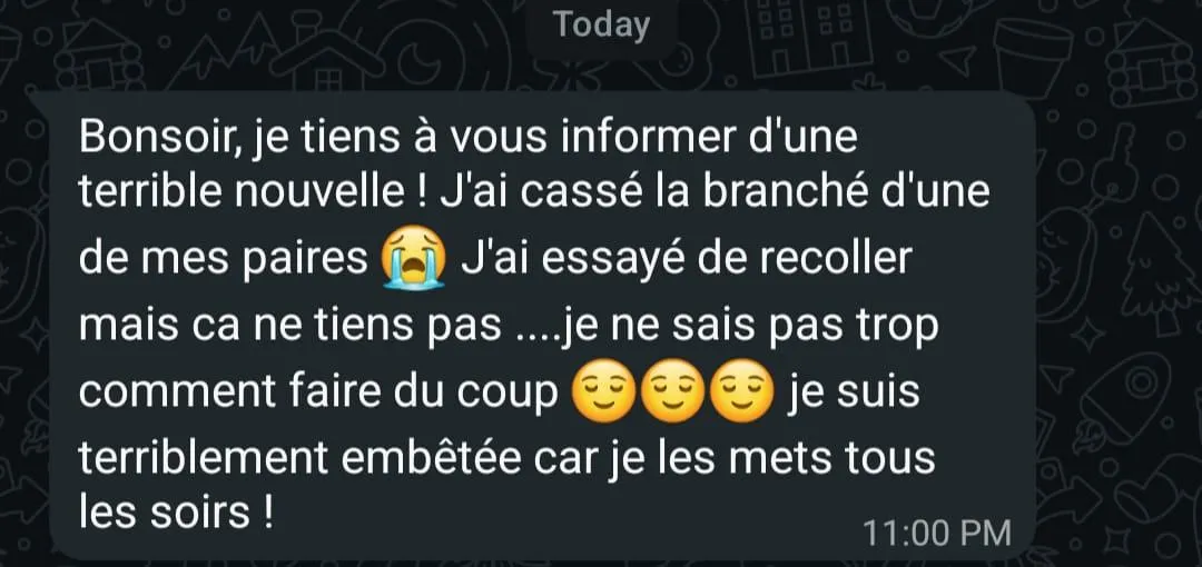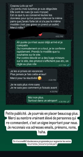 Toute garantie Loïs Kedochim (sous 90 jours ou après 90 jours passés après la commande) nécessite l'approbation au préalable, et non systématique, de la marque Loïs Kedochim et selon les modalités suivantes exclusivement : un appel vidéo organisé par la marque Loïs Kedochim, où le porteur des lunettes uniquement énonce et montre le problème rencontré. La marque Loïs Kedochim se réserve le droit de refuser toute demande jugée abusive ou non couverte pas les garanties ci-dessus.