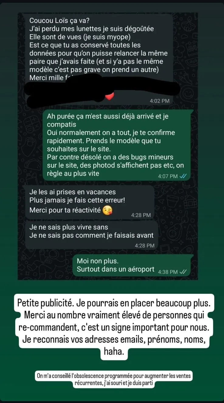 Toute garantie Loïs Kedochim (sous 90 jours ou après 90 jours passés après la commande) nécessite l'approbation au préalable, et non systématique, de la marque Loïs Kedochim et selon les modalités suivantes exclusivement : un appel vidéo organisé par la marque Loïs Kedochim, où le porteur des lunettes uniquement énonce et montre le problème rencontré. La marque Loïs Kedochim se réserve le droit de refuser toute demande jugée abusive ou non couverte pas les garanties ci-dessus.